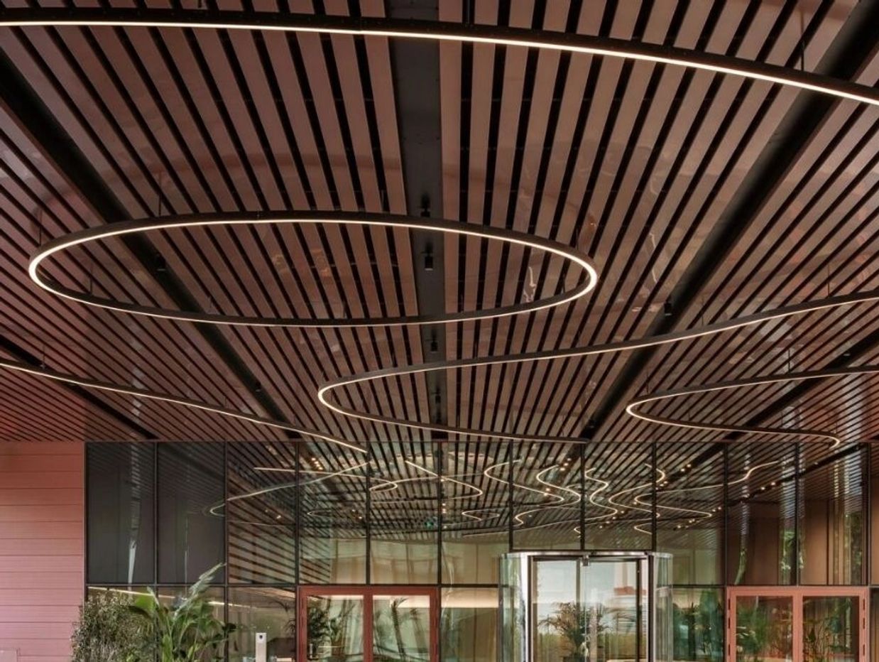 P.R. FORTILAM 84 R ceiling system comprises of 84 mm x 12.5 mm _+ 10% panels roll formed out of 0.50 mm thick G. I sheet. Panels shall be PVC wooden skin plate 140-160 microns polyvinylchloride coated front side. G. I sheet (zinc coating 150 GSM as per UNI EN 10346:2009). Light Reflection should be as per ASTM E-1477-98. Panels are fixed on to roll formed carriers 32 mm wide x 39 mm deep out of 0.6 mm G. I coil with cutouts to hold the panels in module of 100 mm at maximum 1.2 m c/c without insulation and at maximum 1.5 m c/c with insulation. Material should match corrosion test or Resistance to salt fog EN13523-8 e ASTM B117-16 300 hour. Carriers are suspended from the roof or truss by 4 mm dia. galvanized steel wire rod hanger with special height adjustment suspension clip at max. 1.3 m c/c. Hangers are fixed to the roof by ‘J’ hooks or ceiling brackets and nylon inserts. Material should pass fire test as per BIS 476PART 6:1989+A 1:2009 & PART 7:1997. Raw material with EN13501-1:2019 A2S2D0. Panels are factory cut in lengths up to maximum 5 m to suit site dimensions or Architect drawings. G.I Edge profiles or wall angles are 24 mm X 24 mm X 0.35 mm thick and match the colour of the panel. All PVC Coated material should pass scratch test and pencil harness test as per ASTM D 3363-92a B.